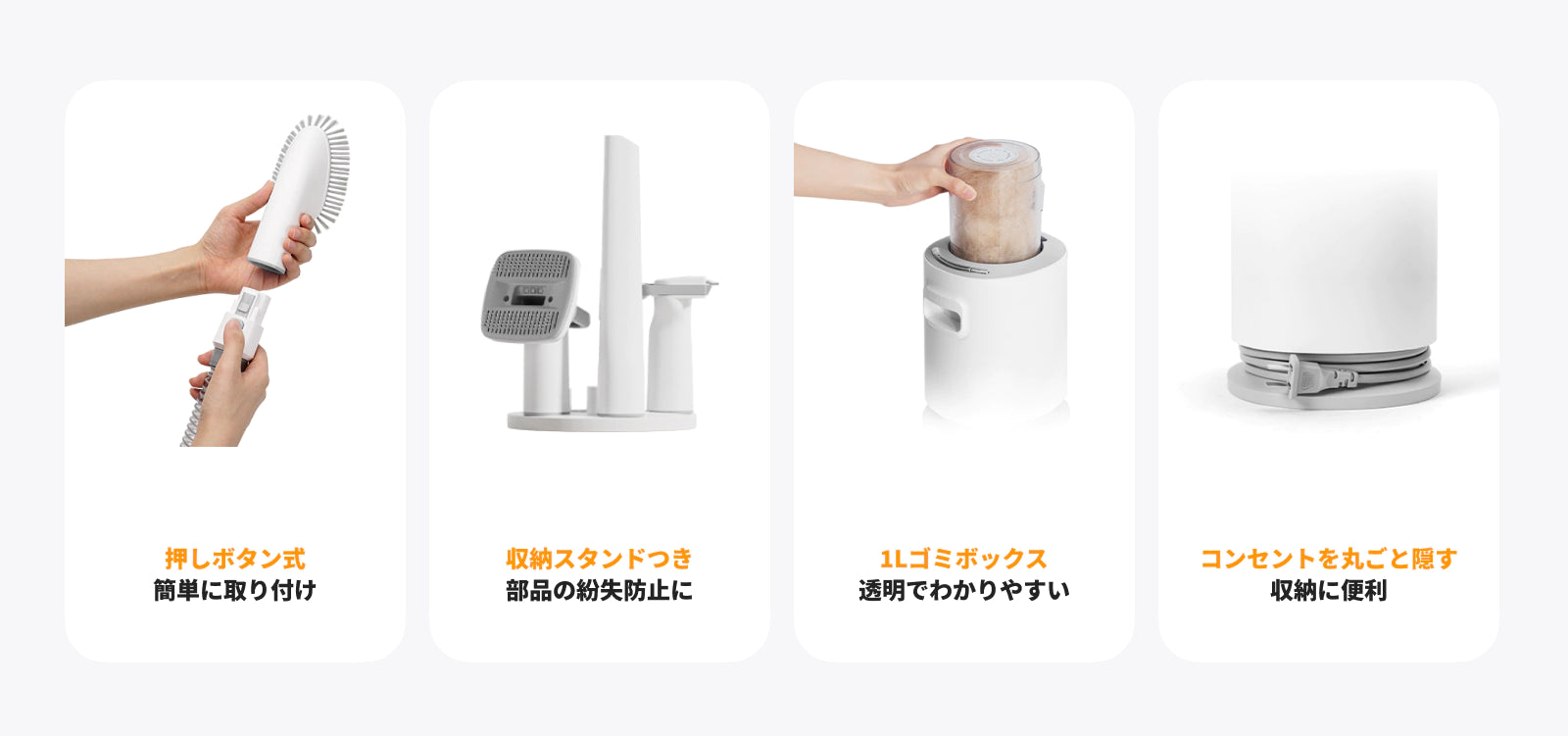細長い形状で吸引力を集中させるため、細かなゴミやホコリを効果的に吸い取ります
