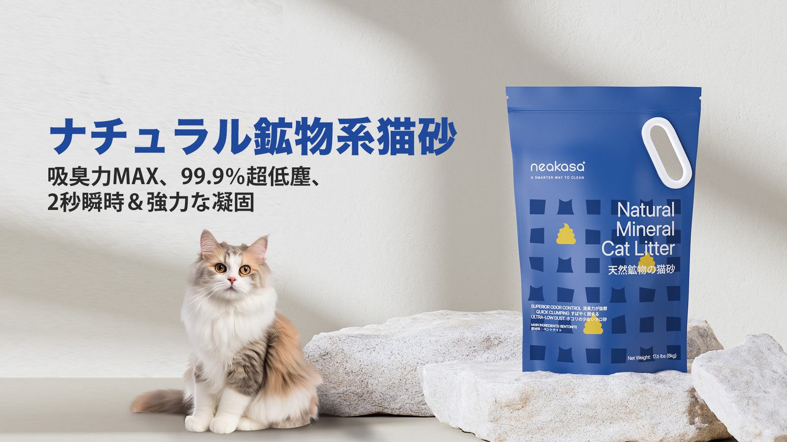 粉塵わずか0.5%以下!空気も呼吸も快適、猫ちゃんにも優しい細かな粒子設計。